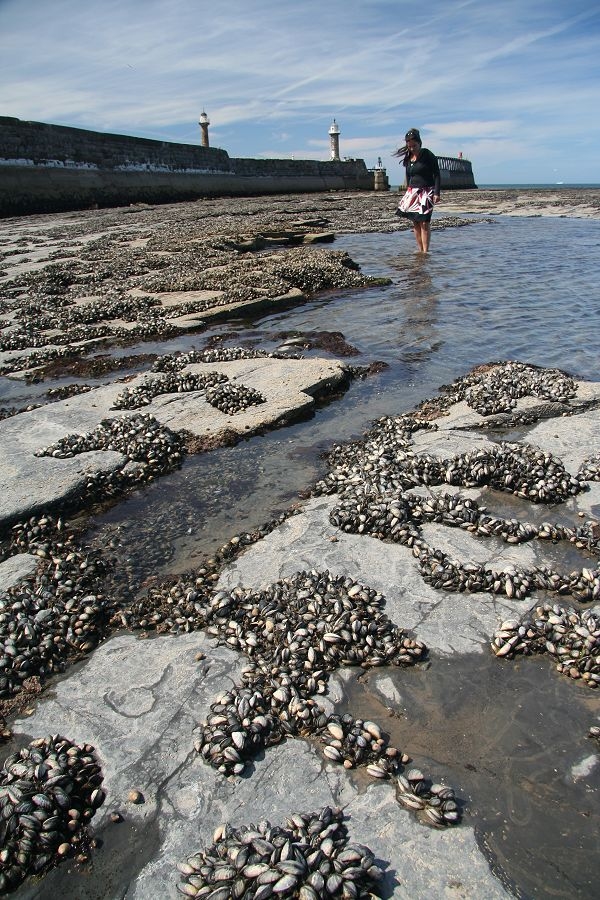 East Cliff Flats lie under the cliff just beyond Tate Hill beach - over the east pier and can only be accessed when the tide is out.  You will find a large expanse of rock, covered in rock pools, fossils and vast quantities of mussels, starfish and other shell fish.  This is an excellent place to explore when you can (it will keep you rock pooling for hours) but don't get too carried away, literally, because the tide comes in very quickly.  Stay close to the access point at the pier unless you know exactly what the tide is doing.  You'll find a tide timetable in Andersons newspaper shop near the swing bridge, or you can just take a look at blackboard on the door of the booth that operates the swing bridge.  Look for the concrete shipwreck - a concrete ship!  No way.