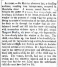 ACCIDENT - On Monday afternoon last, a shocking accident, resulting from intemperance, occurred in Henrietta street. A woman, named Jane of ..., being in the garret of a house, four storeys high, and hearing a disturbance in the street, proceeded to the window for the purpose of seeing what was going on. Being in a state of intoxication at the time, she thrust her body so far through the window that she overbalanced herself and fell into the street - descending with tremendous violence upon a little girlm named Margaret Donkin, six years of age, who happened to be immediately below the window at the time. The child, when taken up, was found to be dreadfully injured, and Dr Taylerson being sent for, he ascertained that both her thighs were broken and that she had also received several severe bruises. It is hoped, however, that by the exercise of great care and attention, combined with medical skill, the life of the child may be saved. The woman, herself, had one or two ribs broken and was otherwise injured, and it is pretty clear that had she not fallen upon the unfortunate child she must have lost her life.